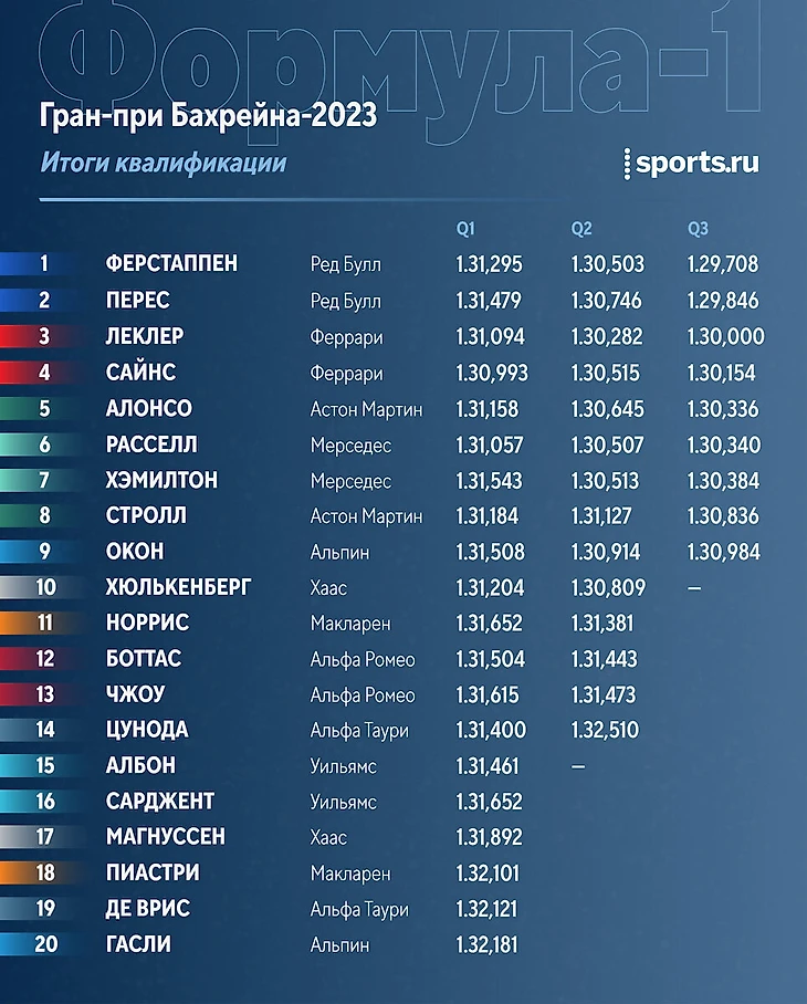 Квалификационный результат на Гран-при Бахрейна установил новый рекорд «Формулы-1» всех времен – по разрыву между первым и последним гонщиками. 20 машин уложились в 1,2 секунды в первом сегменте – такого еще не было.