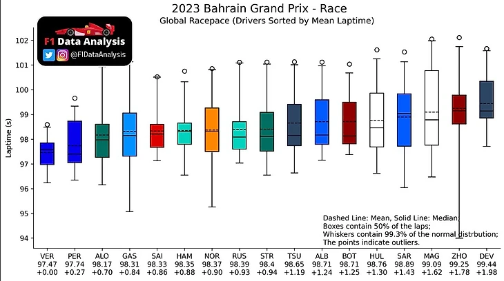 (Ось х – среднее время гонщика, ось у – время в секундах, закрашенный столбик – распределение 50% быстрейших кругов, пунктирная линия – среднее время, сплошная – медианное (половина кругов быстрее, половина – медленнее), вершины линий каждого гонщика – быстрейшие и самые медленные круги (99,3% всех времен), точки – отсеянные времена (круги заездов и выездов из боксов, а также за виртуальным сэйфти-каром и стартовый).