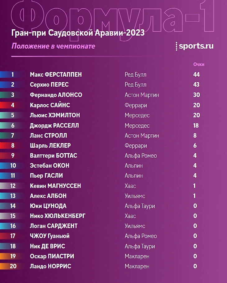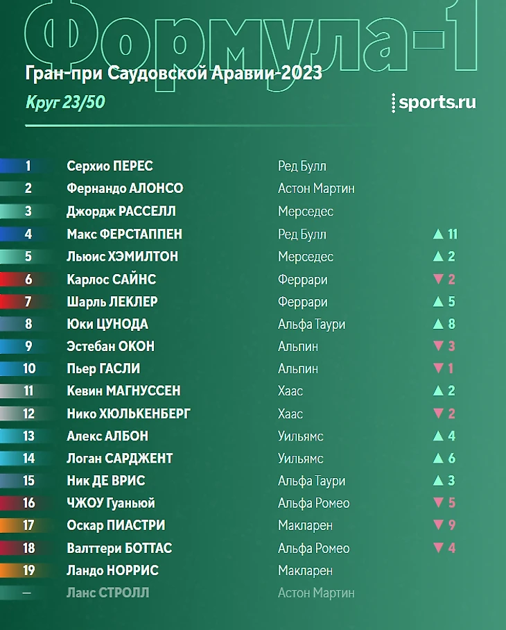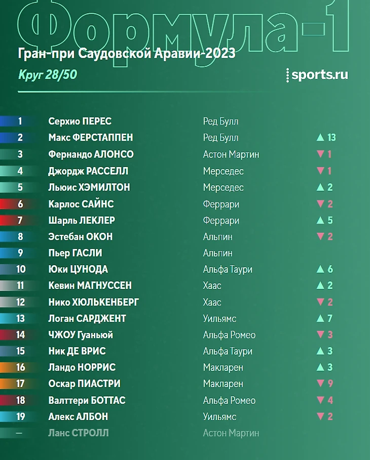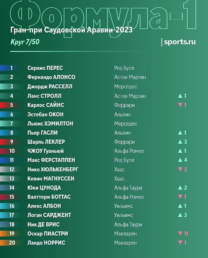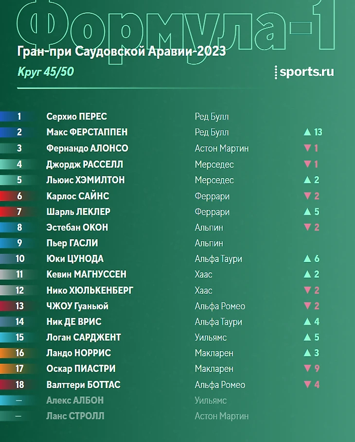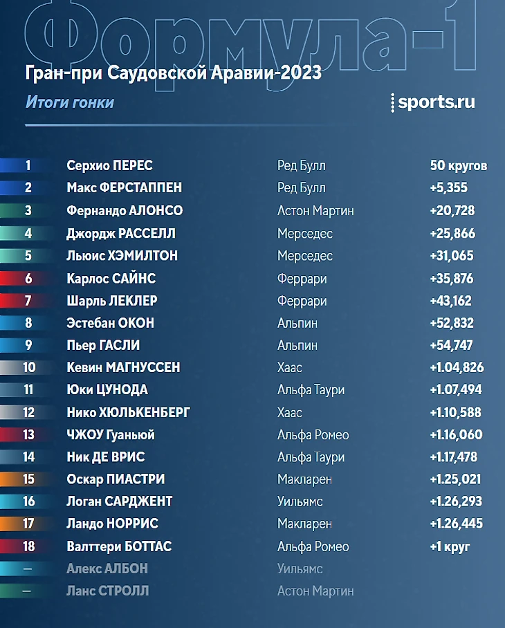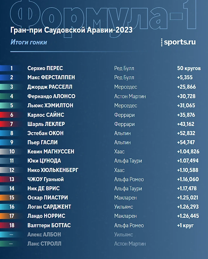 Серхио Перес выигрывает Гран-при Саудовской Аравии! Ферстаппен 2-й с лучшим кругом.
