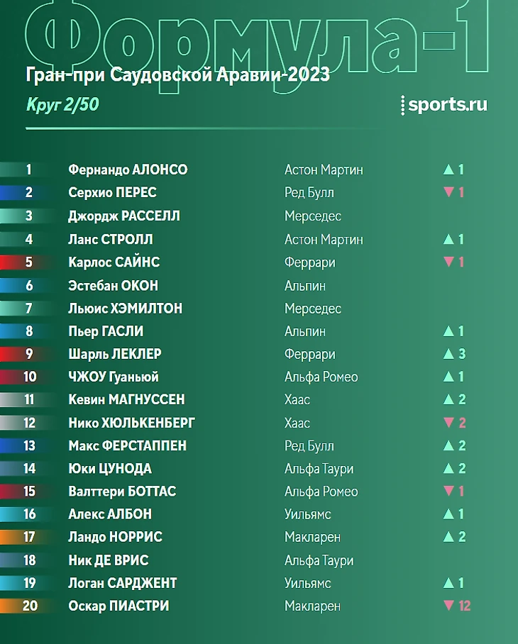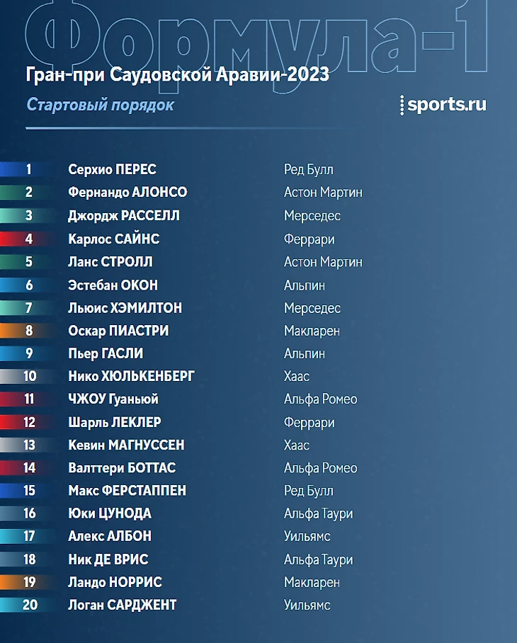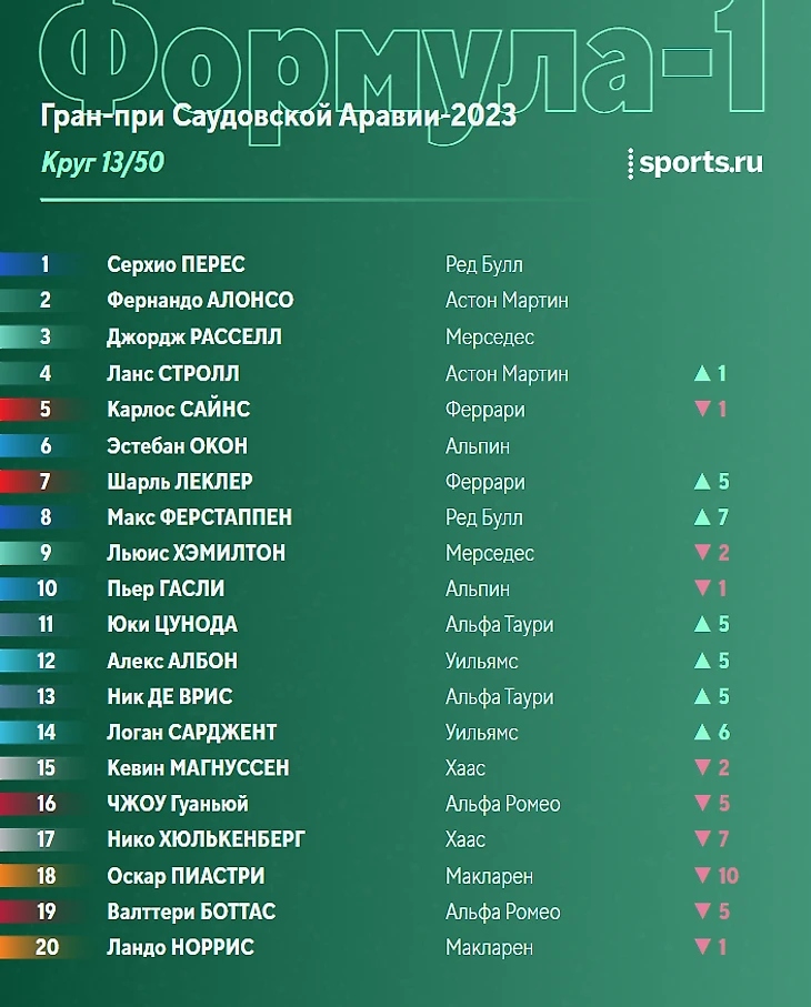 Топ-10: Перес, Ферстаппен, Алонсо, Расселл, Хэмилтон, Сайнс, Леклер, Окон, Гасли, Магнуссен.