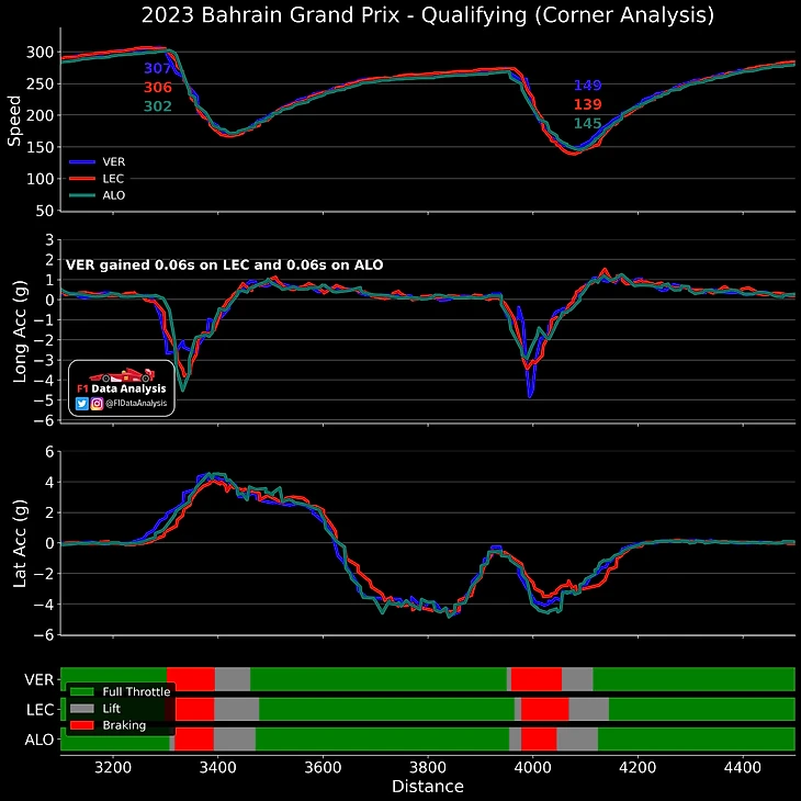 А это – пример сравнения с Леклером и Ферстаппеном: Алонсо давит на педаль меньше, но замедляется примерно так же.