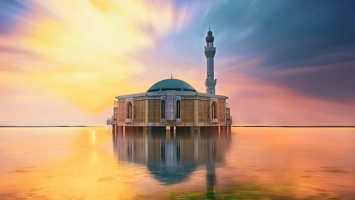 С жемчужно-белым минаретом и аквамариновым куполом, изысканно спроектированная мечеть Аль-Рахма словно поднимается из воды во время прилива.