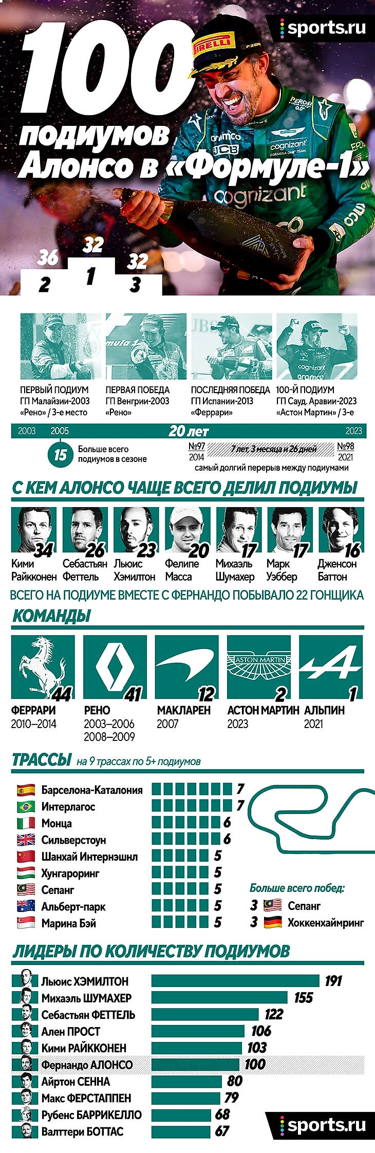 • Между первым и сотым подиумами прошло почти ровно 20 лет: трофей в Сепанге Фернандо получил 23 марта.2003-го, а в Джидде – 19 марта.2023-го!