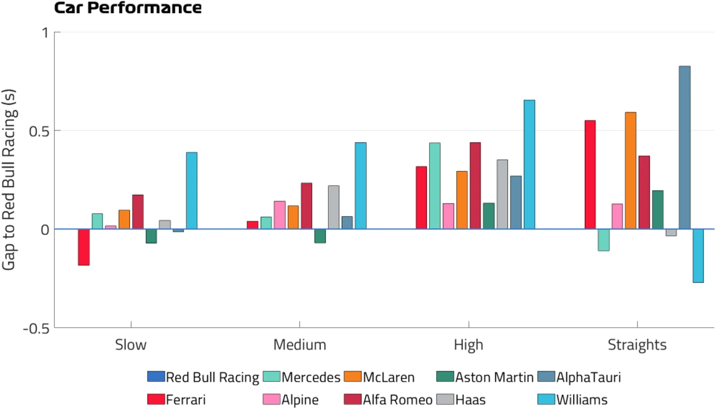 Данные замеров GPS на всех отрезках трасс с официального сайта «Ф-1» показывают то же самое: «Ред Булл» – лучший быстрых поворотах с огромным заделом и в топ-4 с минимальными отставаниями во всех остальных частях трека.