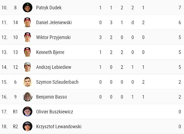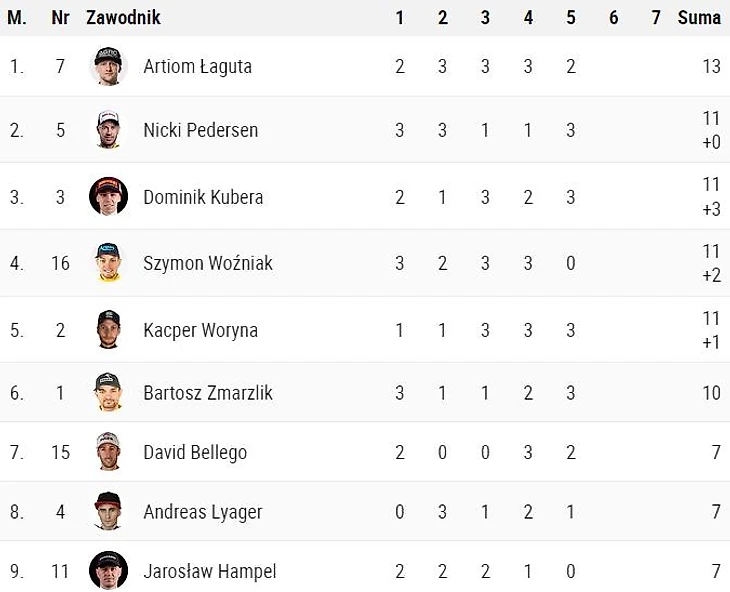 По 11 очков набрали сразу четыре гонщика: Доминик Кубера, Каспер Ворына, Шимон Возняк и Ники Педерсен. Для определения призеров турнира был дан дополнительный заезд. Датчанин отказался от участия в нем и в итоге боролись три поляка. Кубера был лучшим, Возняк вторым, они и стали призерами турнира.