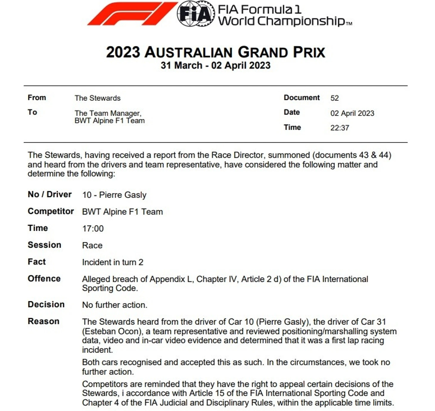 Однако судьи полдня разбирали инцидент и вынесли вердикт: гоночный инцидент. Представитель пострадавшей команды («Альпин») и пострадавший гонщик (напарник Гасли) не стали предъявлять претензий (внезапно – от Окона как от давнего врага Пьера ожидалось что-то серьезное) и согласились, что это был «момент первого круга».