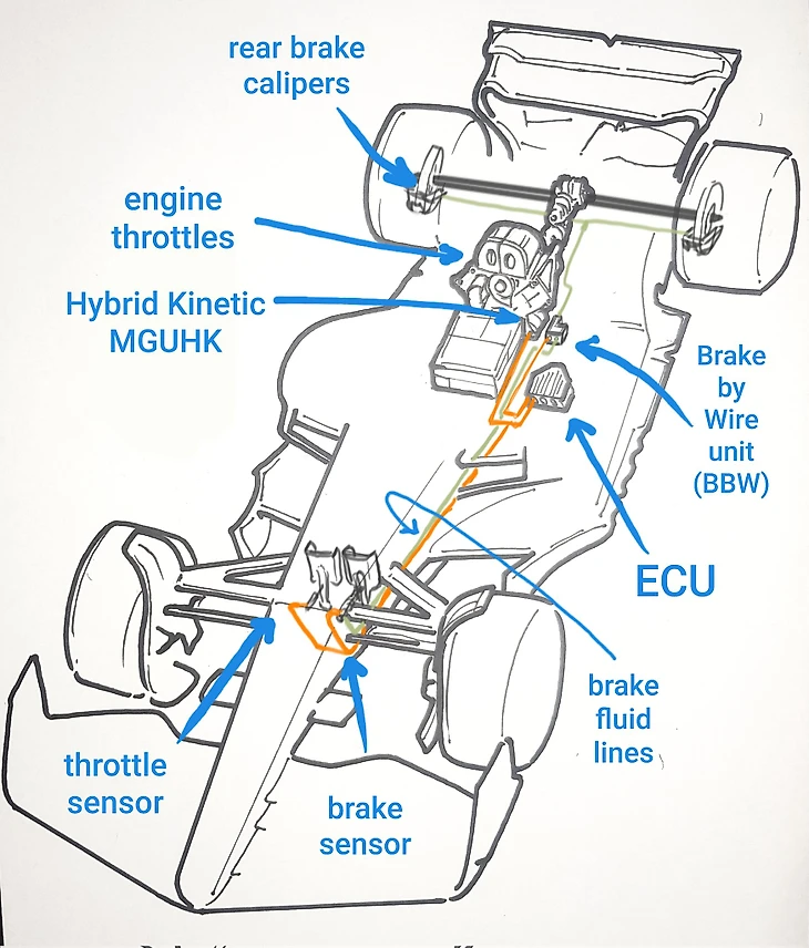 Задние контролируются системой drive-by-wire: давление на педаль, настройки баланса и дифференциала, выставленные на руле, анализируются в ECU. И далее задние тормоза активируются с силой и резкостью, учитывающей и настройки торможения двигателем, и баланса, и желаемой рекуперации энергии, и поступившего по drive-by-wire импульса.