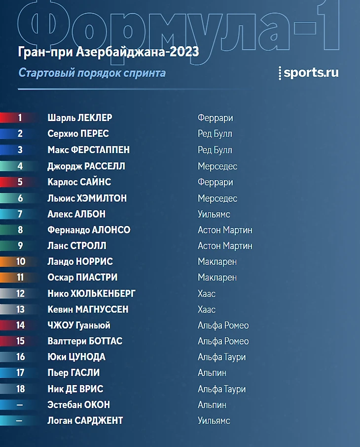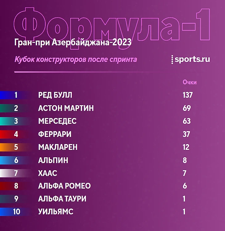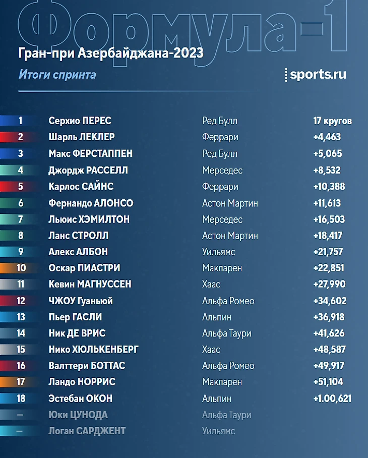 – Перес в итоге выиграл, Леклер удержал второе место, Ферстаппен – третий. В очках – Расселл, Сайнс, Алонсо, Хэмилтон и Стролл – все топ-команды в полном составе.