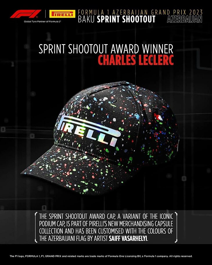 «Трофейная кепка, посвященная спринту – вариация культовой подиумной кепки, которая является частью капсульной коллекции мерча и была кастомизирована с использованием цветов Азербайджанского флага художником Саиффом Васархели» – объяснила шпаргалка компании в соцсетях.