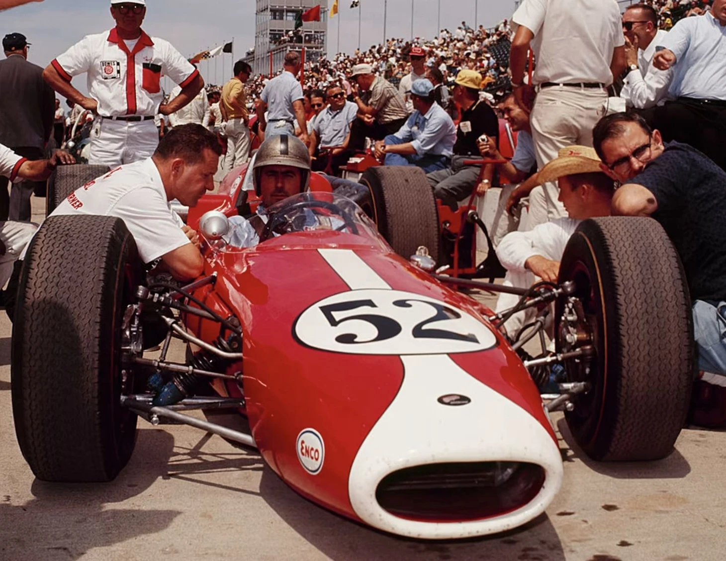 Так что неудивительно, что, помимо завсегдатаев американского происхождения, таких как Герни и Марио Андретти, другие гонщики Формулы 1, такие как Кларк, Хилл, Стюарт, Брэбем, Риндт и Денни Халм, тоже хотели участвовать в знаменитой гонке. Даже у Джона Сертиса возникло искушение испытать там свою Honda RA301 в 1968 году, и что интересно, это был один из первых автомобилей, которые участвовали в гонках на гоночной трассе с задним антикрылом.