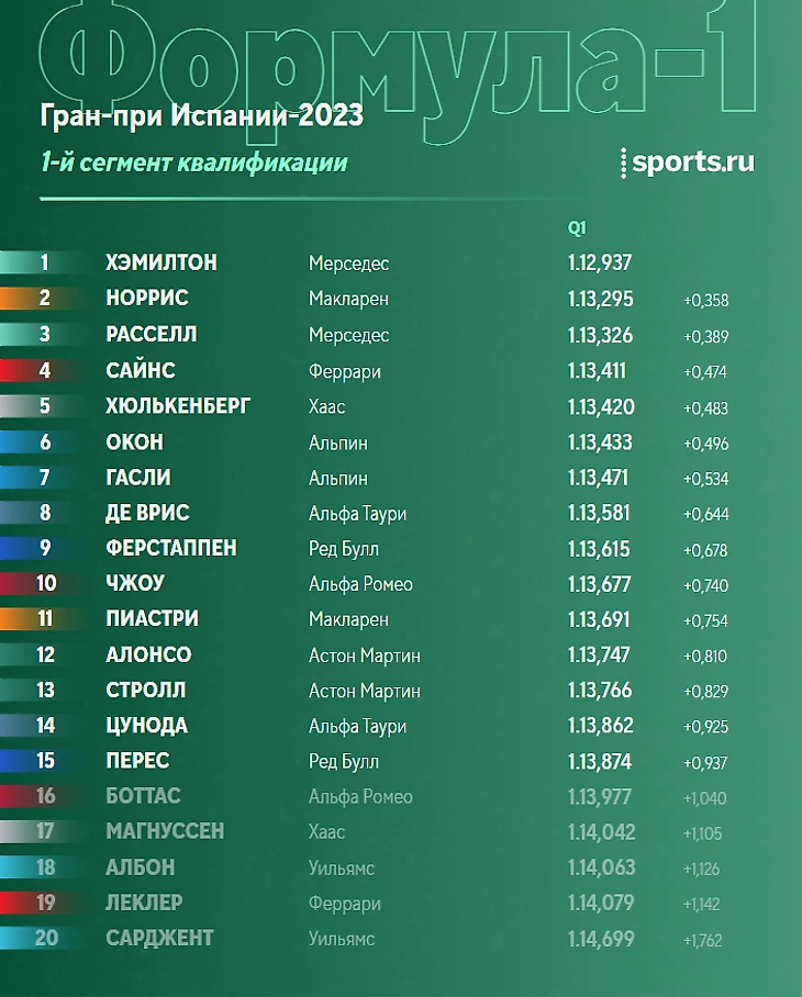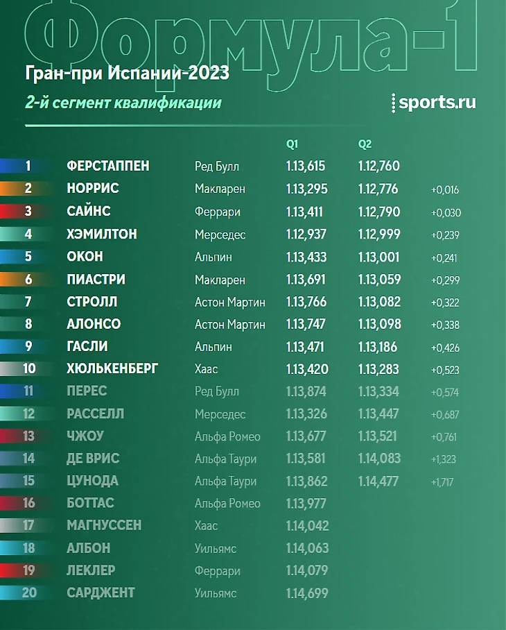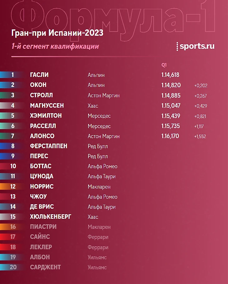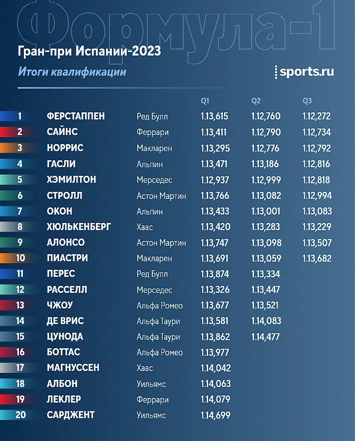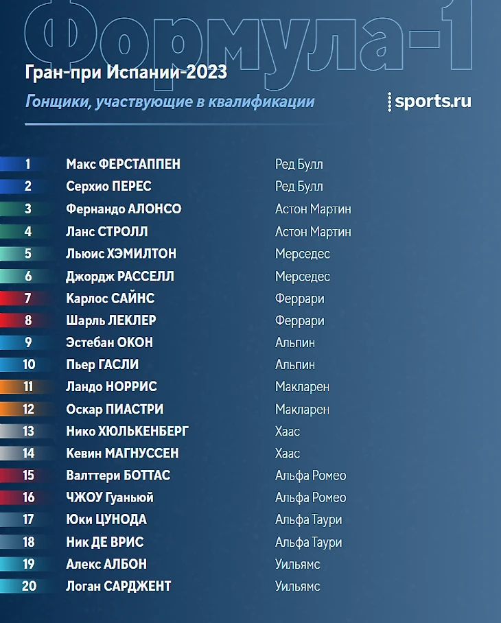Ферстаппен, Сайнс, Норрис, Гасли, Хэмилтон, Стролл, Окон, Хюлькенберг, Алонсо и Пиастри.