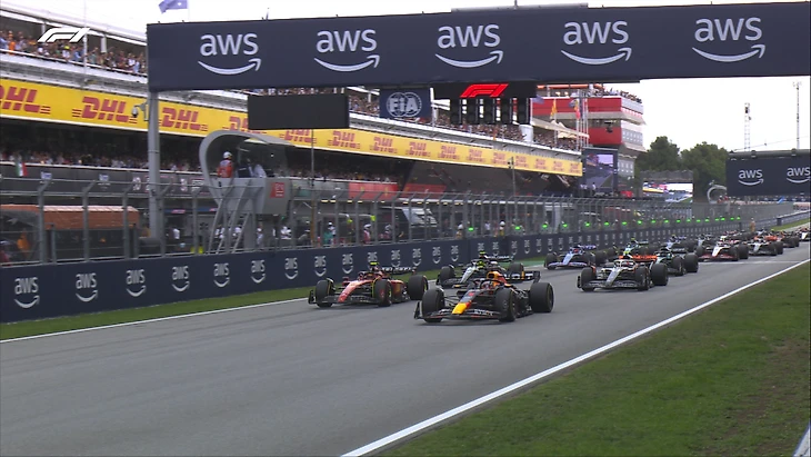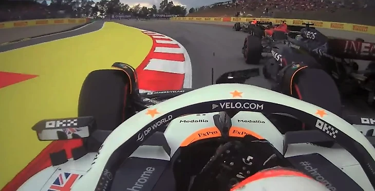 Сайнс чуть лучше разогнался на более мягких шинах, но Ферстаппен занял внутреннюю траекторию и не пустил испанца вперед. Позади был контакт между Норрисом и Хэмилтоном. Норрис пожаловался на повреждение переднего антикрыла - он откатился назад и поехал на пит-стоп.