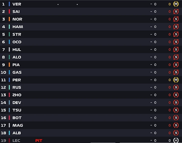 Стролл сменил шины и оказался сразу за пределами топ-10. Сайнс сменил покрышки - и вернулся 9-м, позади Леклера. Интересно, что Карлосу поставили «медиум», а не «хард», на который жалуется Леклер.