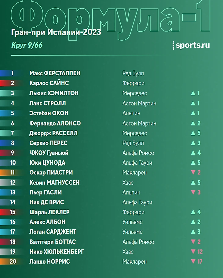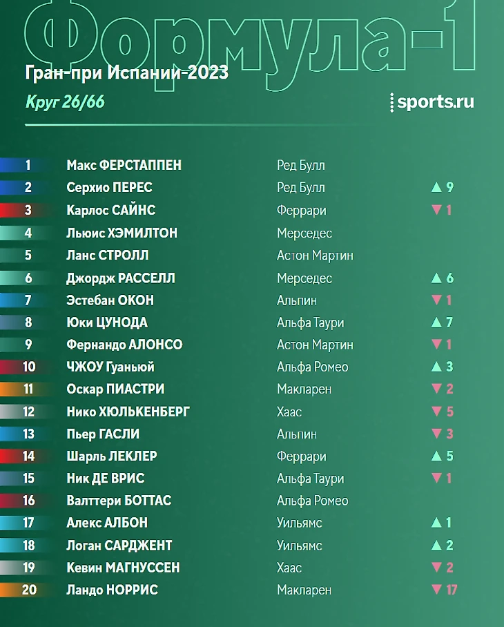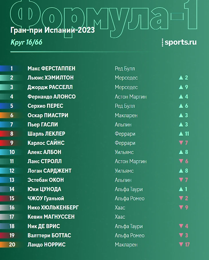 Перед этапом в Барселоне Алонсо приблизился к Пересу в борьбе за вторую строчку общего зачета, Ферстаппен же оторвался от напарника на 39 баллов.