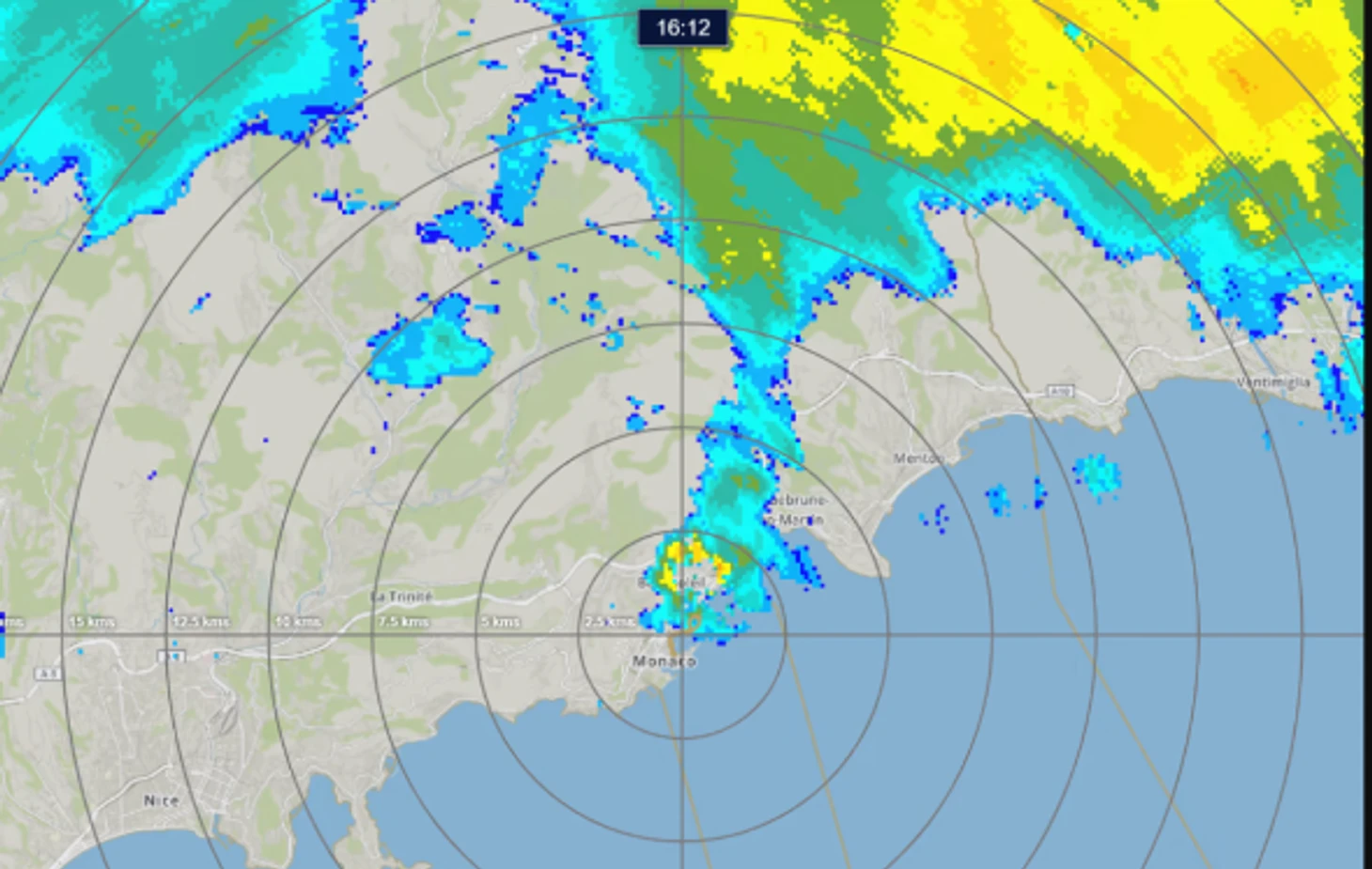 Радар погоды за 40 секунд до первого пит-стопа Фернандо, трек в центре – тогда все выглядело так, словно дождь закончится, а ливень идет стороной: