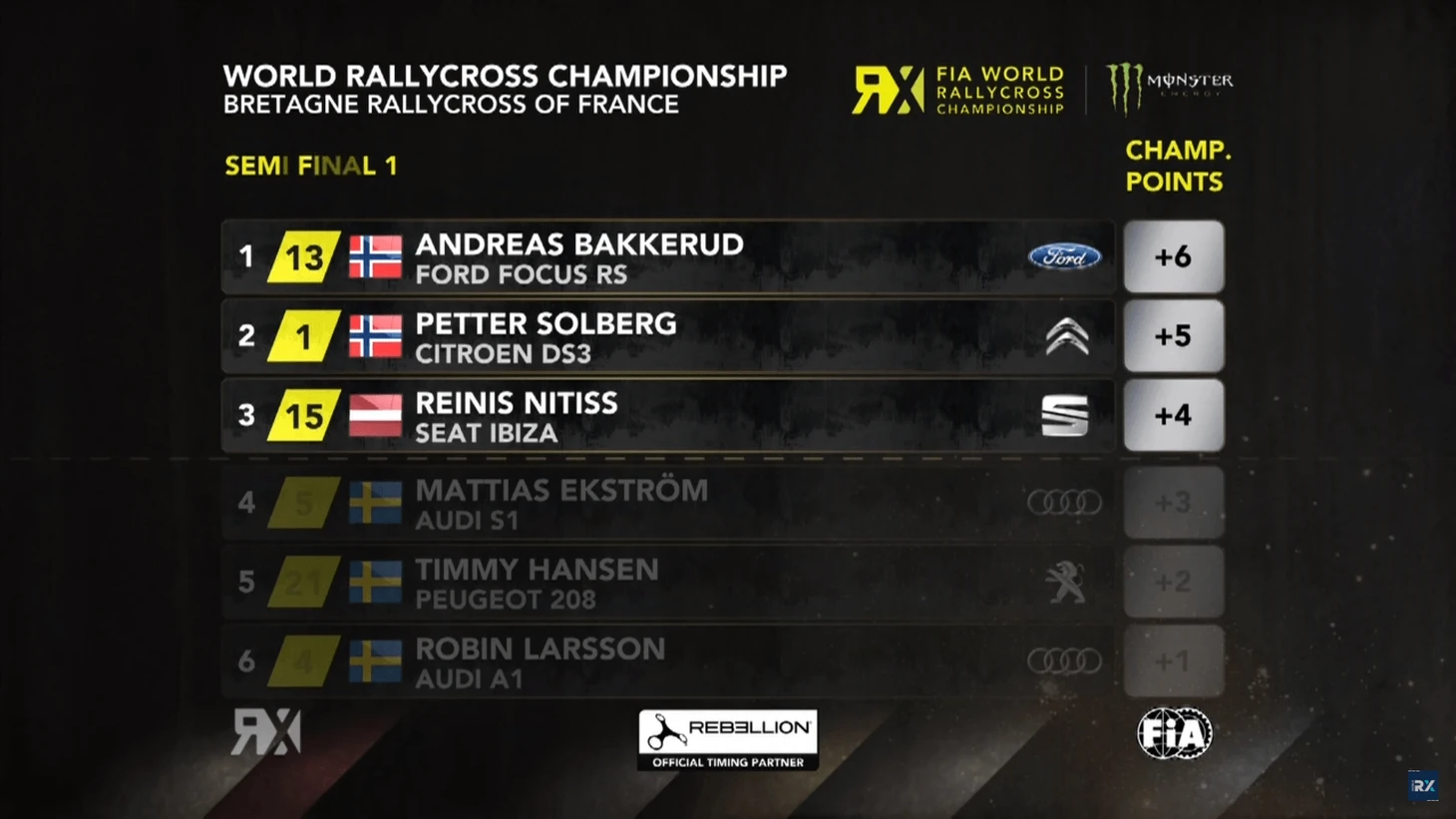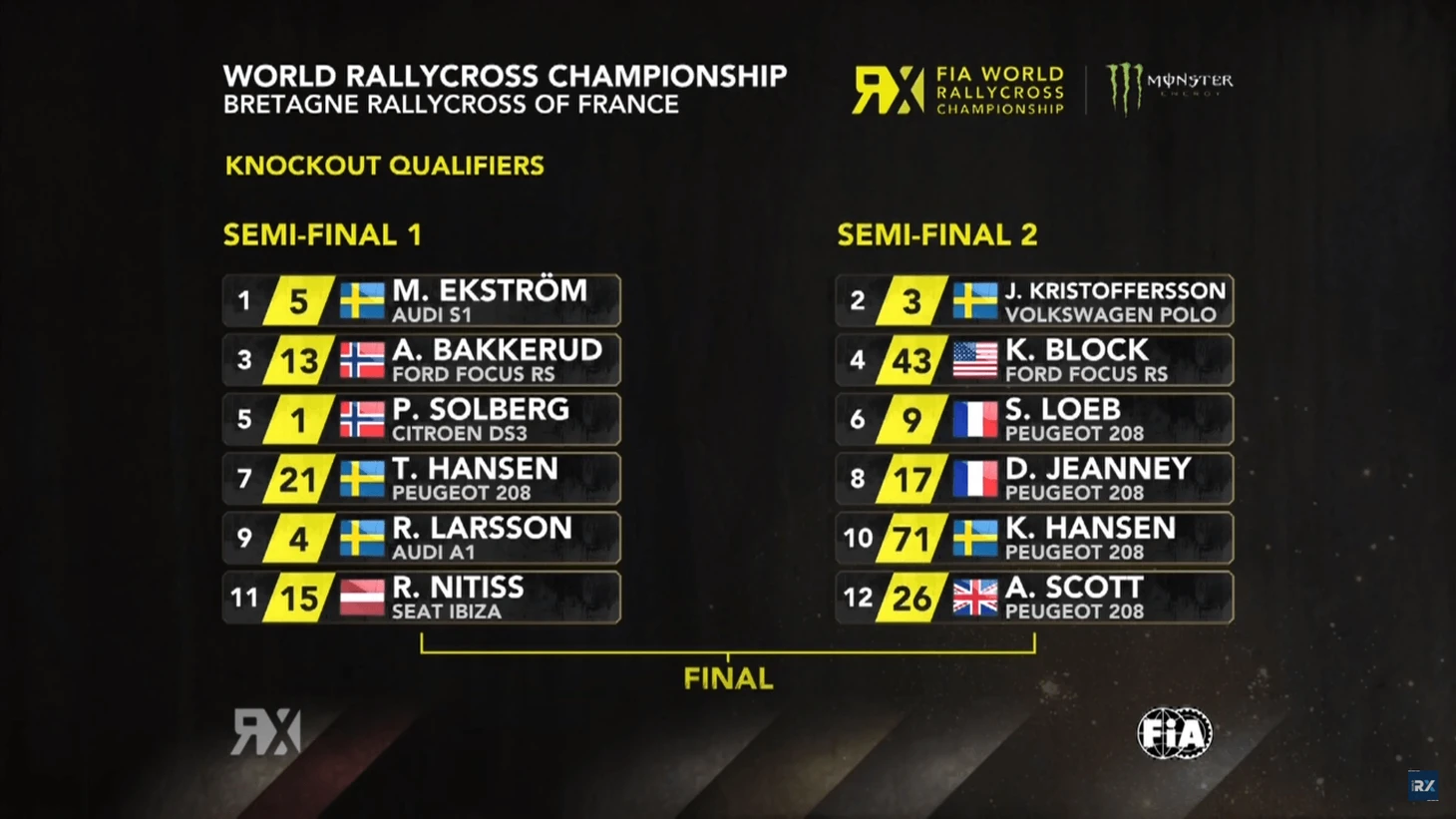 После четырех квалификаций 12 быстрейших гонщиков выходят в полуфиналы. Пилоты, занявшие нечетные позиции, попадают в первый полуфинал, четные — во второй. Места на стартовой решетке занимаются по результатам всей квалификации, первые два гонщика занимают поулы, каждый в своем полуфинале.