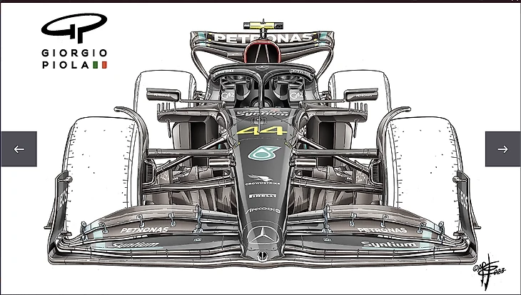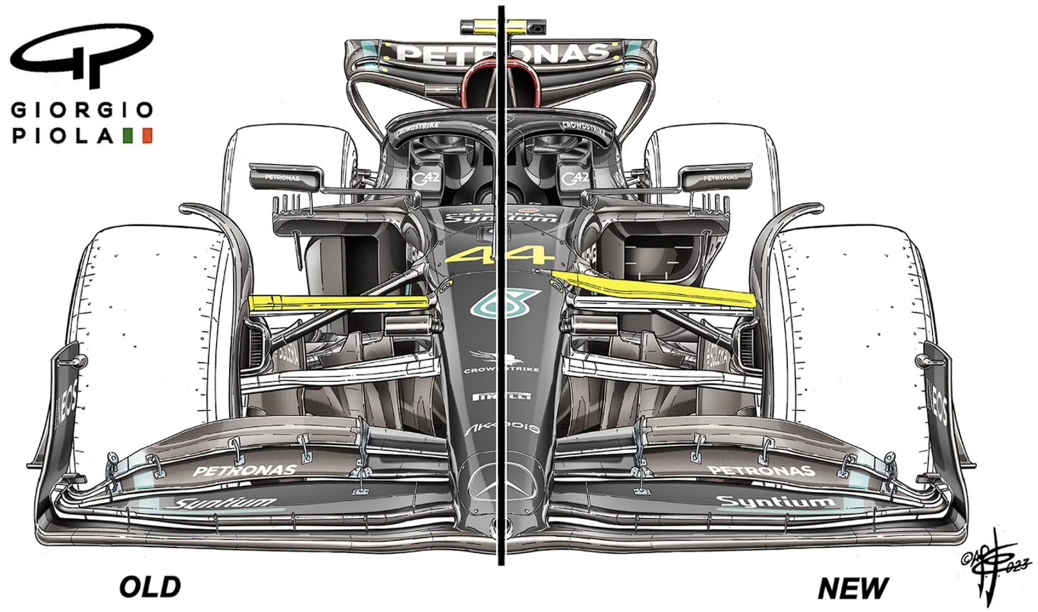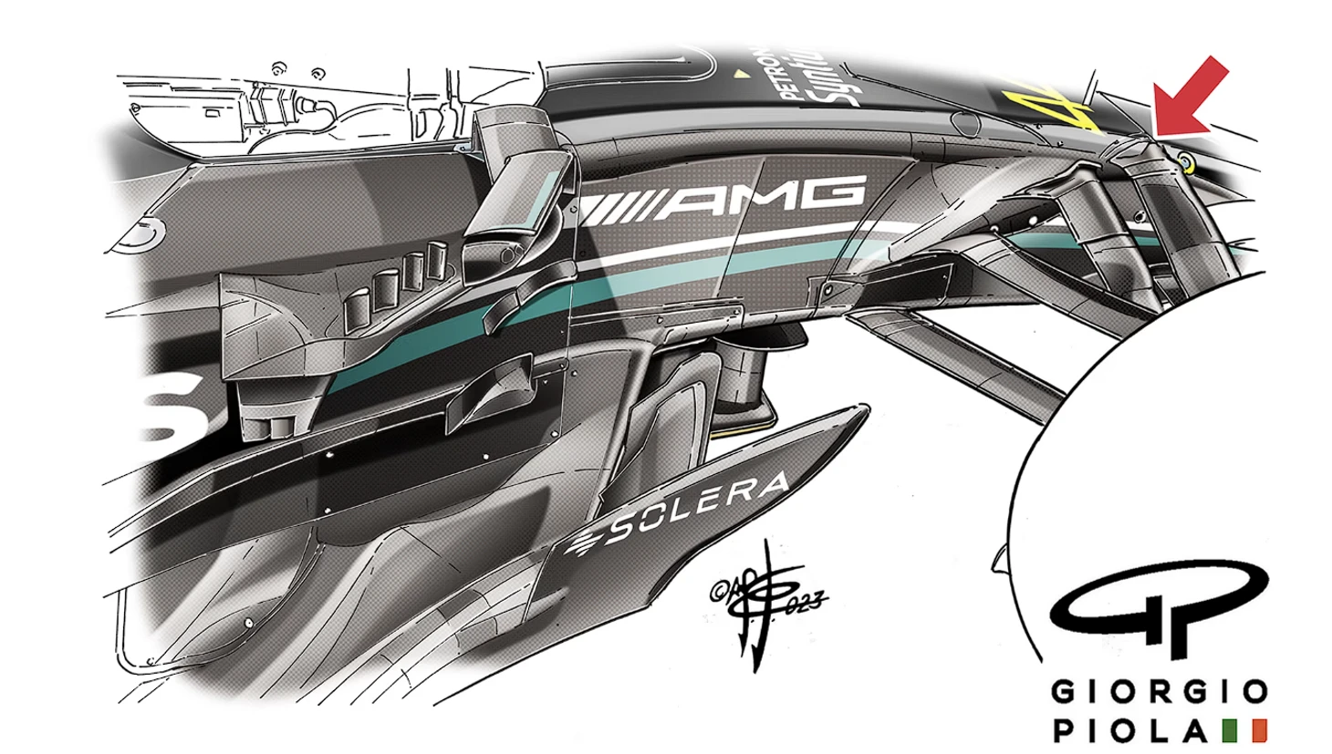 Благодаря новому более высокому переднему верхнему рычагу «Мерседес» смог выровнять его с тягой, задним верхним рычагом и нижним задним рычагом, чтобы создать каскадирующее аэродинамическое понижение давления, направленное к впускным отверстиям туннелей, нижним краям боковых понтонов и днища.