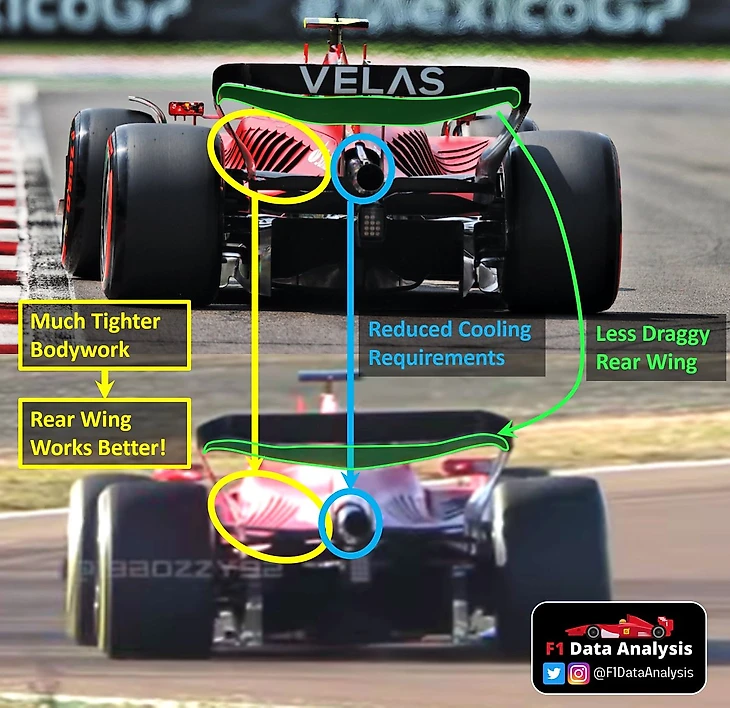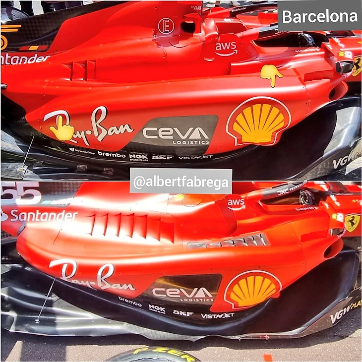 Разница между прошлогодним F1-75 и нынешним SF23: серьезная переработка заднего антикрыла, перепаковка охлаждения, более обтекаемый корпус. К общей эффективности самого шасси (без мотора, днища, подвески, переднего антикрыла и прочего) принципиальных вопросов никогда и не было в прошлом году, а в этом тем более: если исключить «Ред Булл», Скудерия здесь – одна из сильнейших.