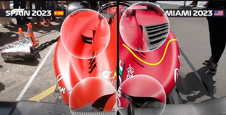 «Да, это следование основному тренду 2023-го. Не говорю, что «Феррари» точно напрямую это копировала, но вот эта глубокая выемка рядом с высокой секцией… Да, «Феррари» не сильно копирует «Ред Булл», но, вероятно, ищет вдохновение в ряде других машин».