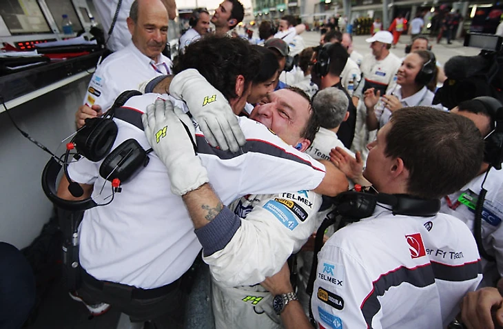 Еще в квалификации пилоту «Заубера» стоило бы петь славу, поскольку, пробившись в десятку сильнейших, в итоговом протоколе он оставил позади представителей «Феррари» и «Уильямса». Однако тогда успех мексиканца недооценили, больше пеняя представителям «алых» и «синих»: мол, те недостаточно грамотно распорядились техническим потенциалом болидов. В частности, механическим сцеплением и отзывчивостью машин на тонкости пилотирования. К чести Чеко, ролью второго плана он довольствоваться не стал — и уже спустя сутки вышел на авансцену, явив себя во всей красе при сложнейших погодных условиях. Да, не обошлось без помощи инженеров: как признался после гонки Петер Заубер, решение переобуться в дождевую резину на излете первого круга принадлежало капитанскому мостику. Но это нисколько не умаляет дальнейших заслуг Переса, по итогам стартовой неразберихи и красных флагов очутившегося в призовой тройке. Прогрессирующий пилот не только удержался в темпе лидеров, но и превзошел самого Фернандо Алонсо! Причем не только в лотерейном формате непогоды, но и по подсохшей трассе. В какой-то момент Серхио даже реально претендовал на лидерство с заманчивыми перспективами триумфа. Но ошибка при слишком агрессивной атаке поворота, увенчавшаяся выездом за гоночное полотно и потерей времени, вынудила его довольствоваться серебром. Которое, впрочем, в контексте всего уик-энда могло смело приравниваться к золоту.