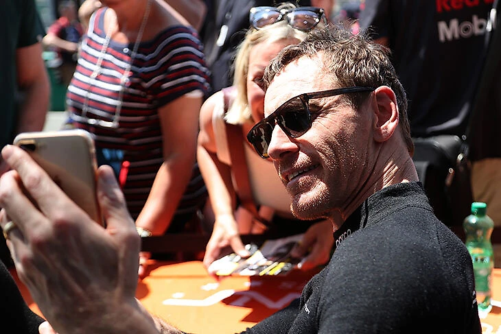 В гоночном режиме Фассбендер такой – почти инкогнито: шлем, ирландский флаг и простое «Майкл» на комбинезоне обезличивают: