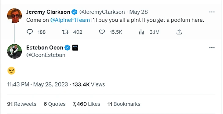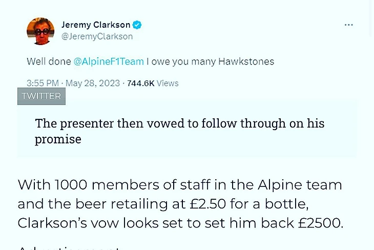 Легендарный ведущий Top Gear и The Grand Tour Джереми Кларксон вновь влюблен в «Ф-1» – пристально смотрит ее второй сезон подряд и даже слегка опрометчивые обещания в твиттере. Например, когда на Гран-при Монако Эстебан Окон на средней «Альпин» ехал на подиум, Кларксон пообещал команде пива в случае успеха…