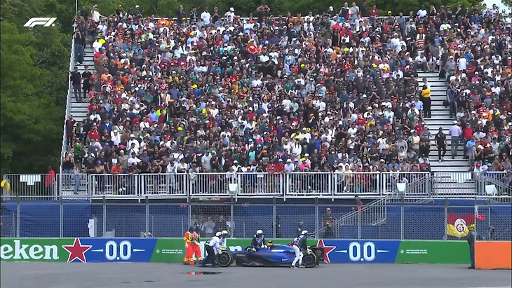 Сарджент сработал хорошо, маршаллы смогли быстро закатить болид «Уильямса» за заграждения - и заезд продолжается в обычном режиме.