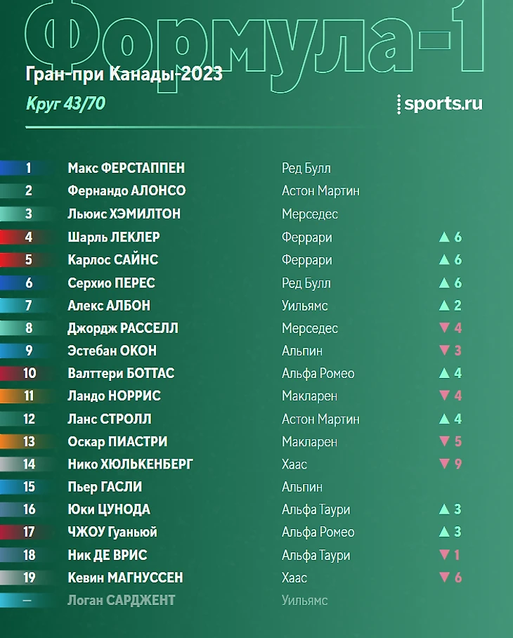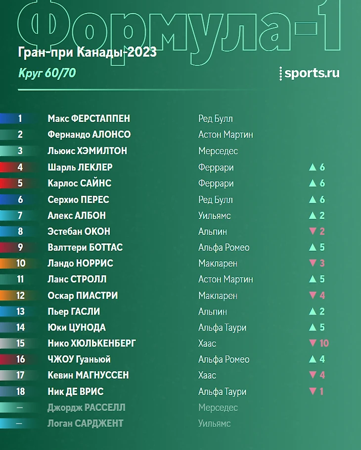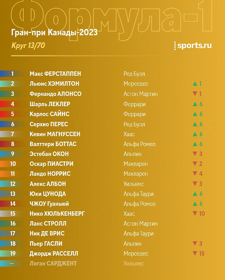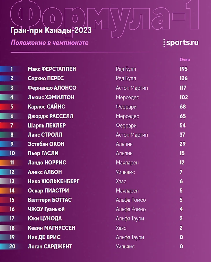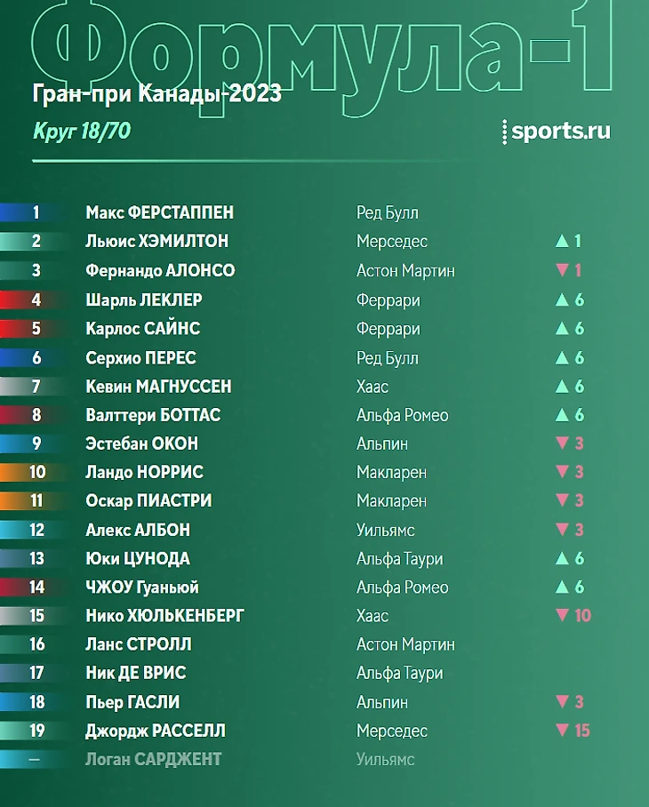 Ситуация в чемпионате перед этапом в Монреале: Ферстаппен отрывается, Хэмилтон борется за топ-3 с Алонсо.