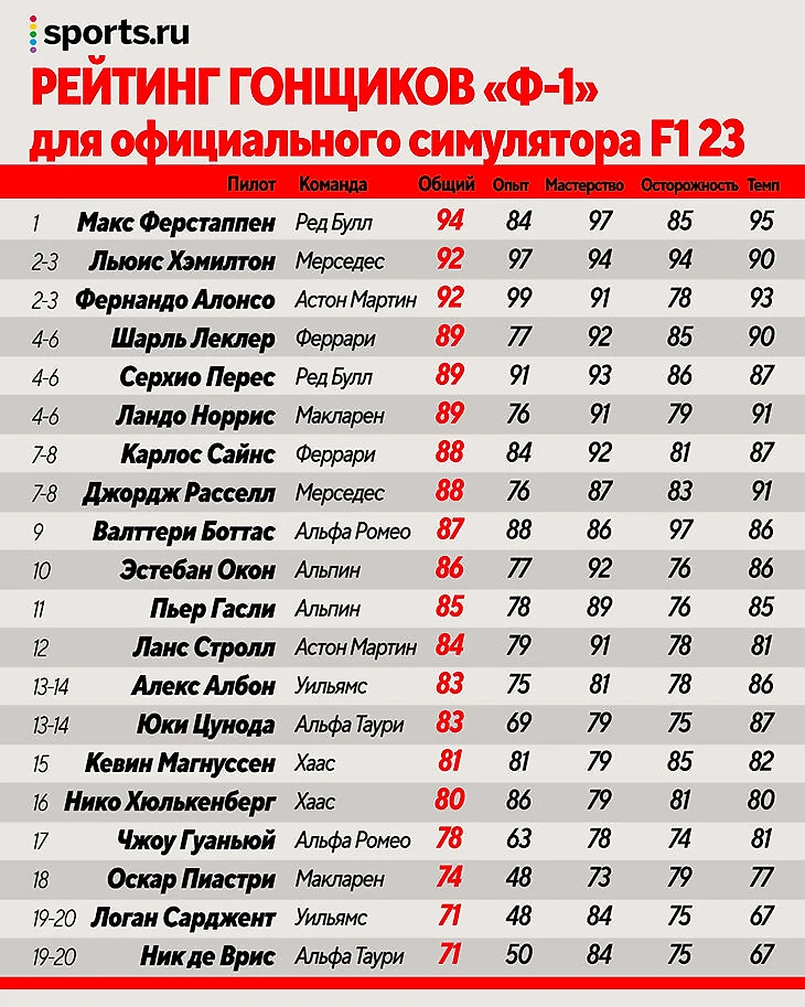 У гонщиков «Формулы-1» есть традиционная забава: в начале лета удивляться своим рейтингам для официальной игры-симулятора от Codemasters. После широкой критики прошлого года в этот раз для оценки пилотов пригласили более профессиональную панель экспертов – вроде бывшего пилота «Ф-1», симуляторщика «Мерседеса» и аналитика Sky Sports F1 Энтони Дэвидсона и комментатора F1 TV Алекса Жака.