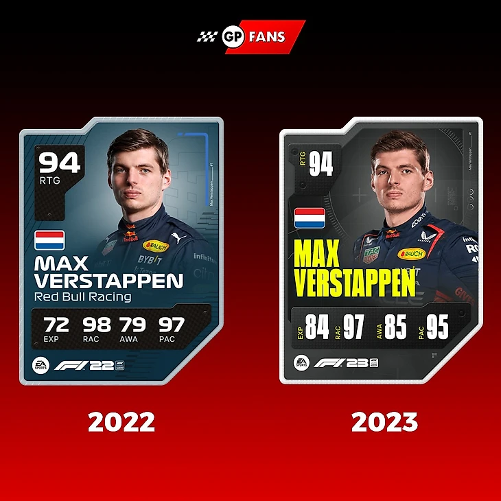 Кстати, Ферстаппен стал первой «жертвой» апдейта рейтингов – за время между записью и публикацией анонса с оценками его общий балл повысили с 93 до прошлогодних 94. Но в остальном две карточки чемпиона выглядят словно оценками разных гонщиков: