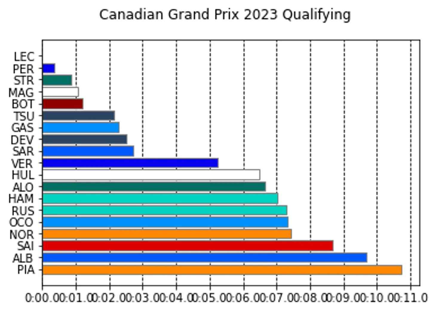 На первый взгляд представлена парадоксальная картина, но на данном графике показан лучший круг гонщика, показанный в течении всей квалификации и разница между ним и лучшим кругом каждого гонщика.