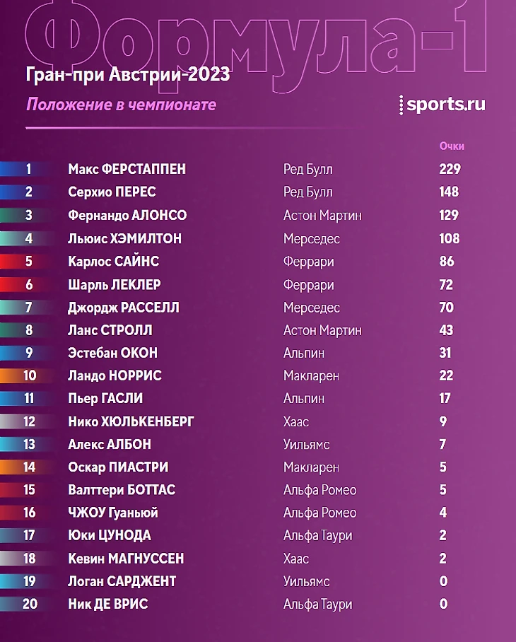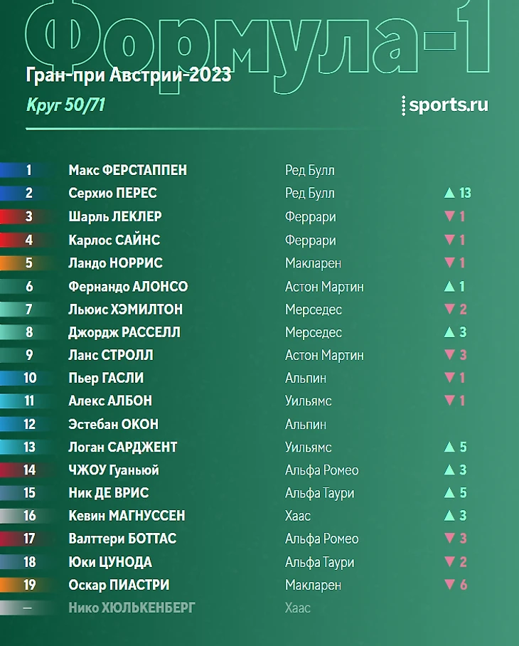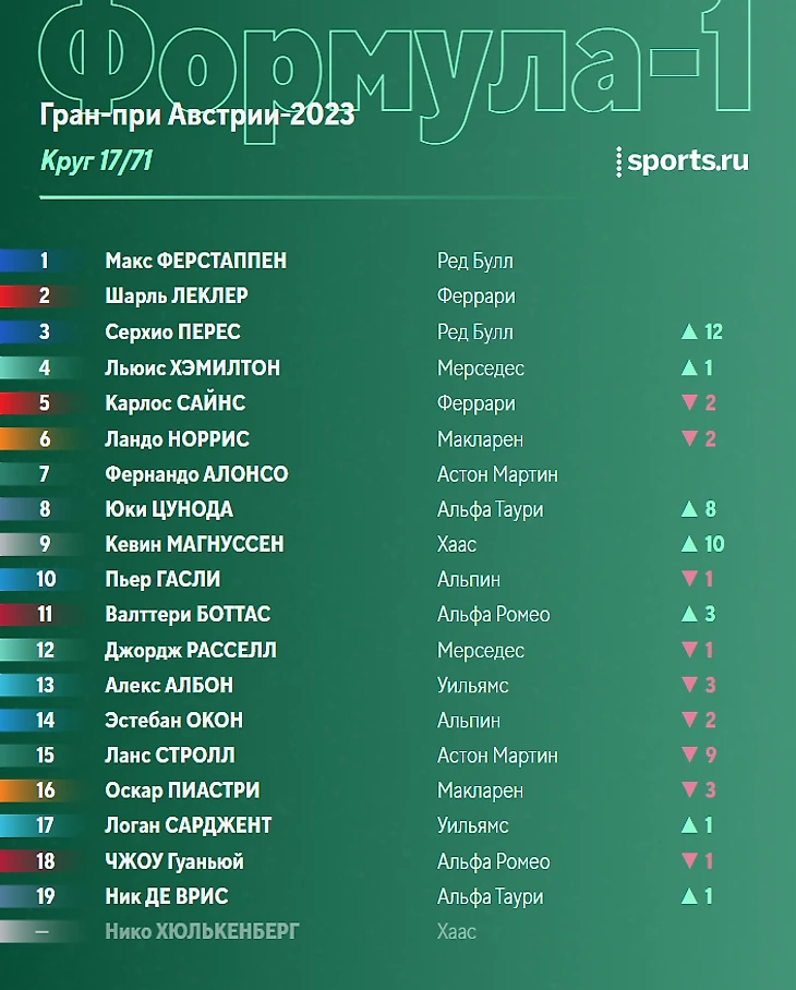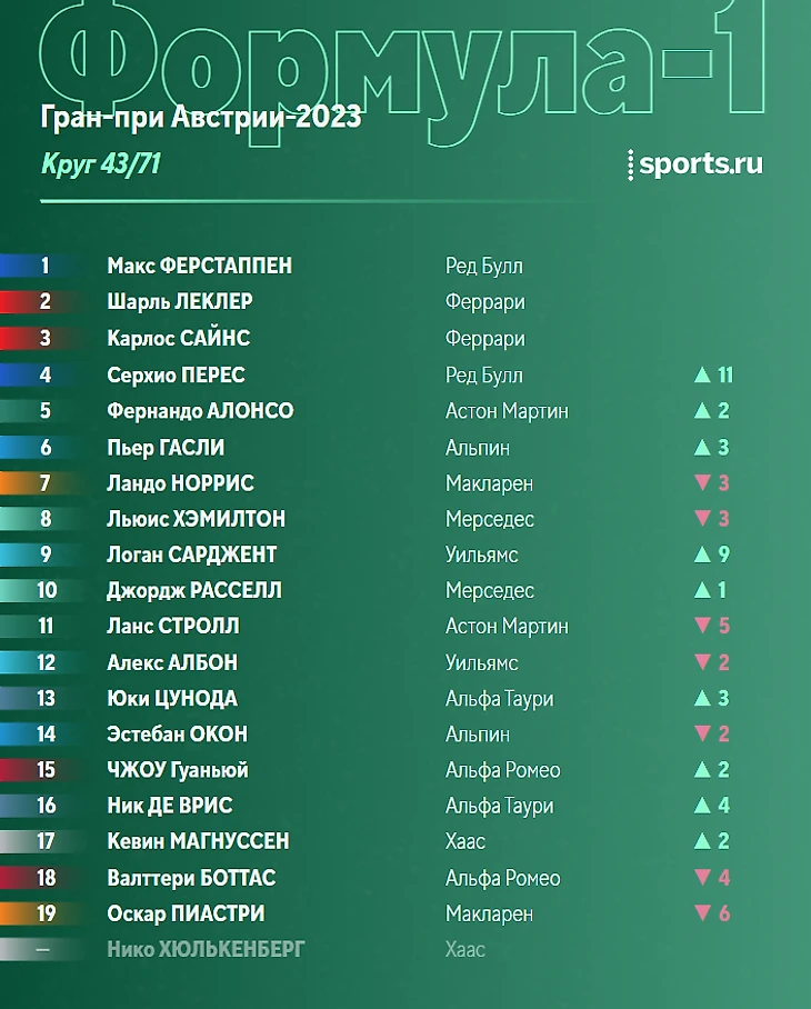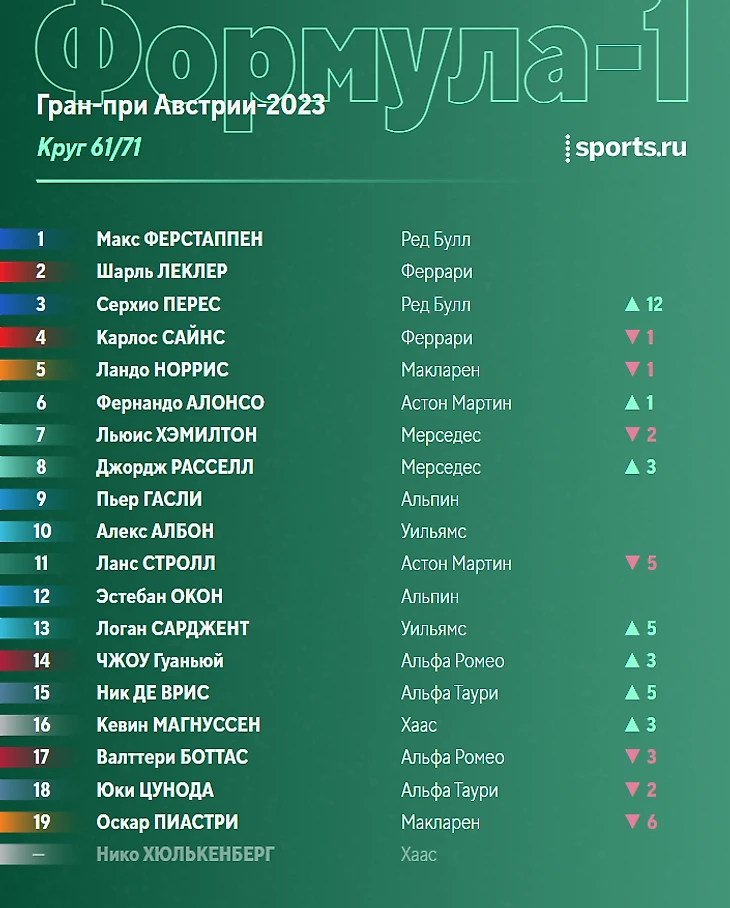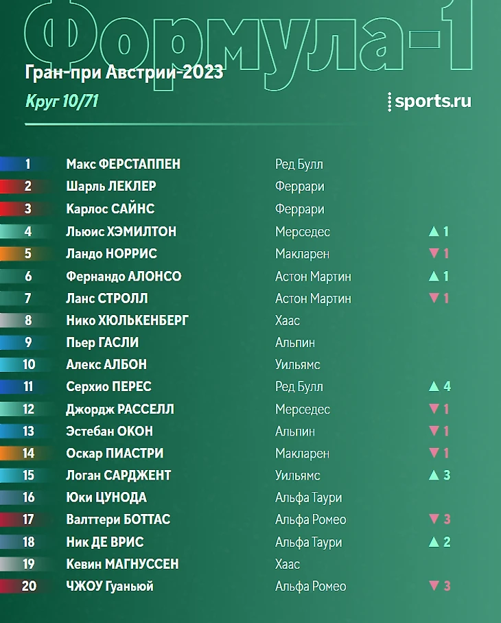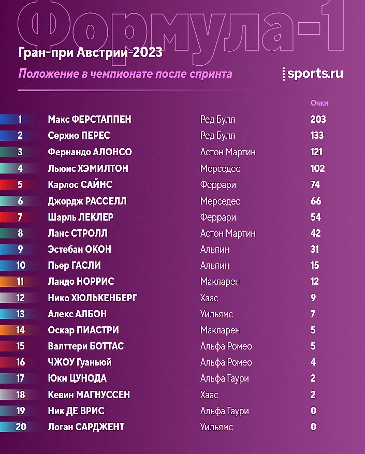 После победы в субботнем спринте Ферстаппен укрепил лидерство в общем зачете, Алонсо сражается с Пересом за вторую строчку.
