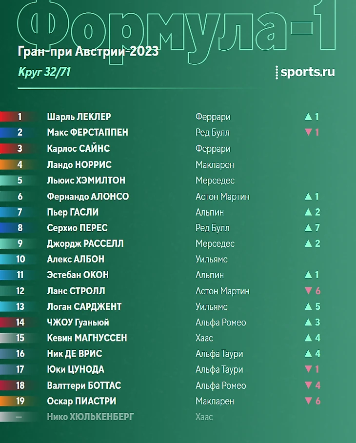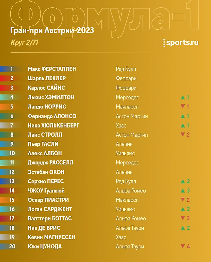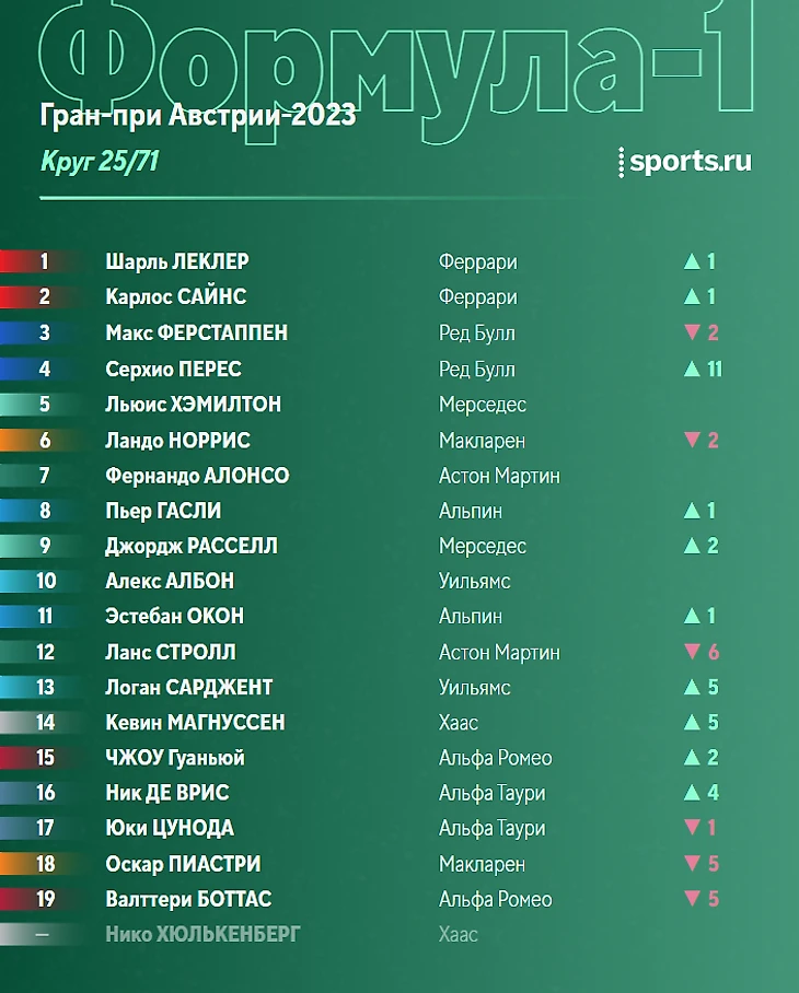 Шарль вернулся на втором месте, оба «Ред Булл» теперь лидируют. «Феррари» держатся на третьем и четвертом месте, а их уже преследует Норрис. Дальше разрывы значительные: Алонсо - 6-й, Хэмилтон уступает ему 2 секунды, а самому Льюису 10 секунд проигрывает Расселл.