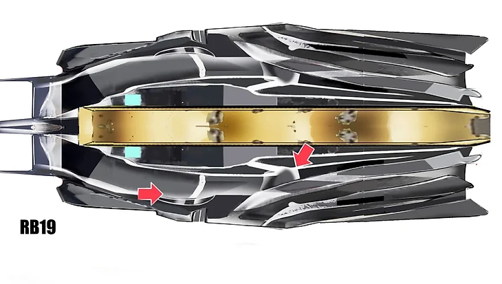 Именно здесь и отличается «Ред Булл». У RB19 есть «перепады» в уровнях каналов – с ужиманиями и расширениями площади сечения. Они сделаны для контроля над скоростью потока воздуха и структурированы, похоже, именно так, чтобы добиваться конкретных показателей.