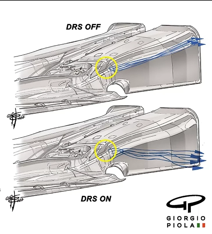 Еще на днище RB19 нашлось место, которое «включается» в ускорение на прямых при открытии заднего крыла DRS. У «Ред Булл» в таких условиях колоссальное преимущество благодаря взаимодействию потоков на пластине и балочном крыле, а Джоджо Пиола и Марк Хьюз показали на официальном сайте «Ф-1», как меняются потоки и на днище: