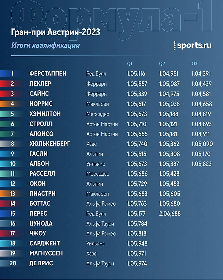 «Сегодня у него был темп, была машина, с которой он легко мог бы оказаться на первом или втором ряду стартовой решетки. Он ехал в одном темпе с Максом – нужно было просто держаться в пределах трассы и не заезжать за белые линии, – согласен и шеф «Ред Булл» Кристиан Хорнер. – Это произошло один раз, второй раз, третий раз инженер сказал: «Чеко, просто оставайся в пределах белых линий». Но закончилось все вот так. Просто очень досадно, что все так вышло, ведь Чеко мог быть там, мог справиться. То, что мы выиграли поул – это фантастика, но также присутствует чувство неполноценности».