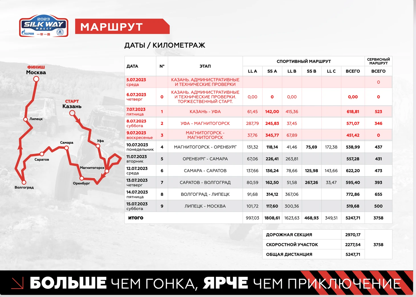 С 7 по 9 июля участники национального первенства проедут от Казани до Уфы и далее до Магнитогорска, преодолев общую дистанцию 1628 км, включая 733 км специальных скоростных участков. Призеры и победители определятся 9 июля после кольцевого этапа в Магнитогорске.