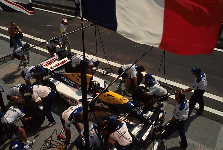 Пока они работали над FW15C Хилл не мог заехать для замены шин. Через пару кругов команда просто сместила болид Алена, чтобы Деймон мог заехать за свежей резиной за 6.73 секунды. Спустя семь кругов Прост выехал из боксов. Это многое говорит о его мотивации, поскольку, потеряв все шансы хотя бы на одно очко, он вышел на старт, намереваясь проехать быстрее всех.