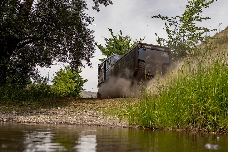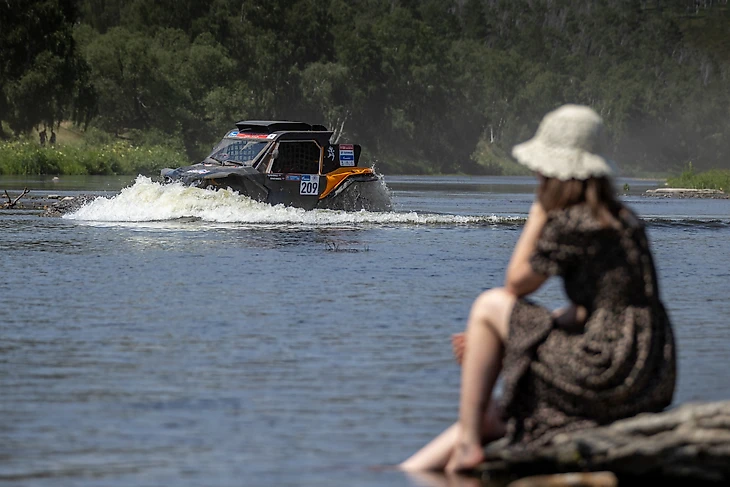 После короткого и коварного участка в зарослях гонка продолжается по раскроенному мелкими речками плато. Один из бродов на пути – узкое русло Урала, за которым начинается азиатская часть России. В ожидании эффектных проездов с кучей брызг на берегах потихоньку собираются жители ближайших поселков и фоторепортеры.