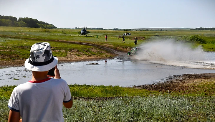 «Привет участникам соревнований!» – восклицает немолодой мужчина, проходя мимо нас на парковке. Из-за бортового номера и наклеек отдыхающие принимают внедорожник медиаэкипажа за настоящую гоночную машину, а узнав, что мы журналисты, начинают подробно расспрашивать о ходе ралли. Внезапно рядом с озером разносится монотонный гул настоящего гоночного мотора. Это едет на бивак сошедший со скоростного участка экипаж одного из багги.
