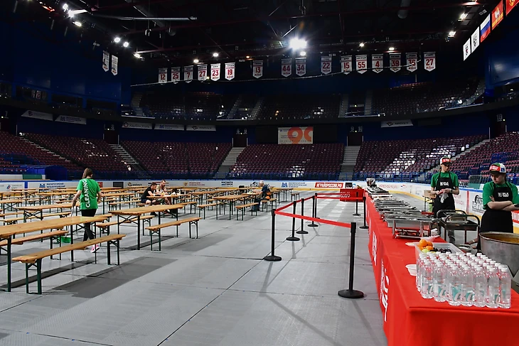 Города по обе стороны «уральского пояса» кроме всего прочего славятся своими хоккейными традициями, поэтому, как и в Уфе, в Магнитогорске нас приютила домашняя площадка еще одного клуба КХЛ – «Металлурга». Прямо внутри арены, на которой выступает «Магнитка», организаторы разбивают большую столовую для всех участников «Шелкового пути» – от экипажей до волонтеров, помогающих нам в каждом городе.