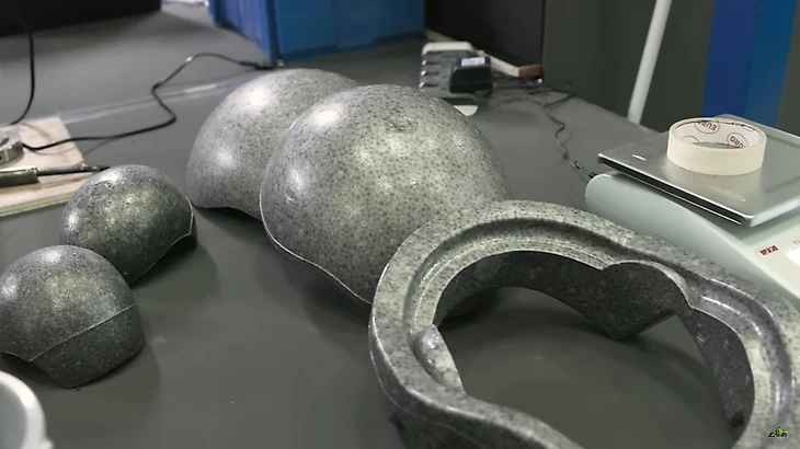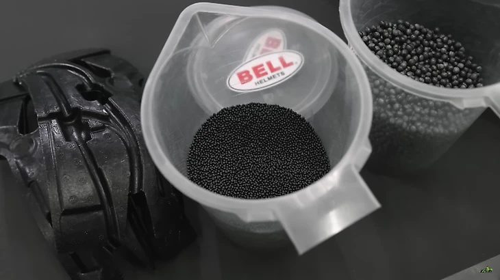 Начинается производство в отделе «пенопласта и впрысков пластиков». Вот эти шарики, изготовленные из вспененного полистирола, заливаются в специальные формы и превращаются во внутренности шлема.