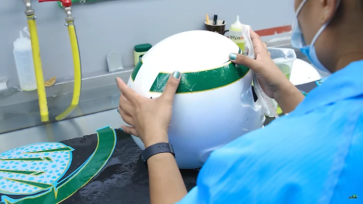 Здесь шлемы украшают виниловыми стикерами. Этот процесс похож на наклеивание на тело переводных тату.