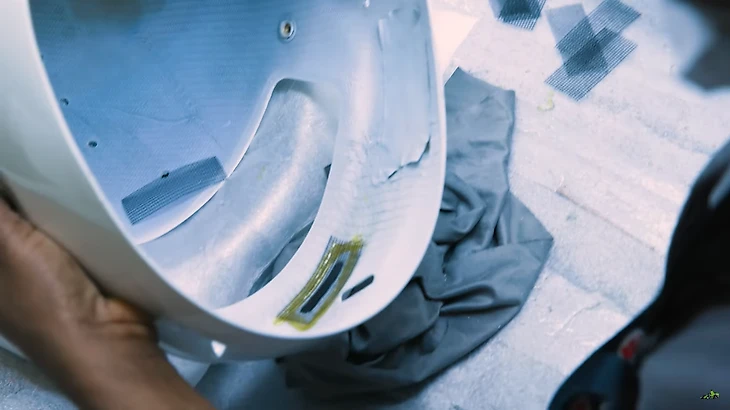 Сначала вентиляционные отверстия подчищают металлической щеткой, и наносят на них клей, чтобы закрыть кусочком металлической сетки, которая препятствует попаданию внутрь шлема мелкого мусора.