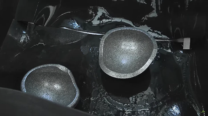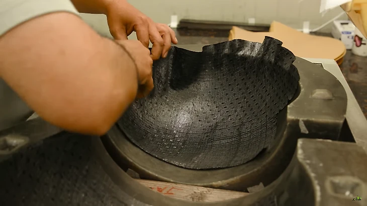 В отделе «ламинирования» оператор покрывает ладони специальным термозащитным гелем, а затем разглаживает эти вырезки по разогретым формам. При нагревании карбоновые листы становятся более податливыми, что позволяет избавиться от складок на изделии при распределении его по форме.