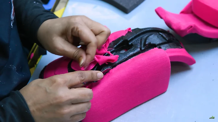 После низ шлема и края отверстия под визор обрамляют резинкой, чтобы смягчить их и обеспечить плотное прилегание забрала.