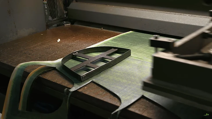 Здесь специальный пресс нарезает карбоновые листы на элементы нужной формы, из которых и собирают оболочку.