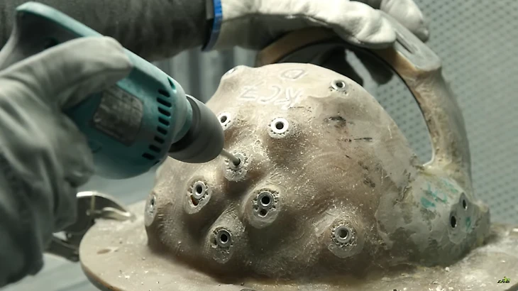 Затем при помощи специального шаблона прорезают в шлеме вентиляционные отверстия и отверстия для крепления визора.