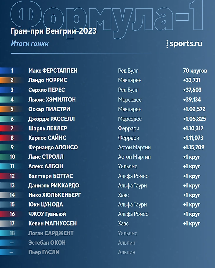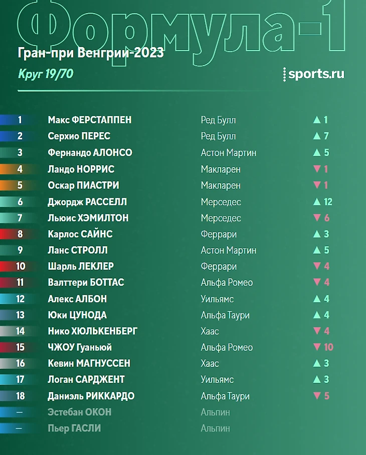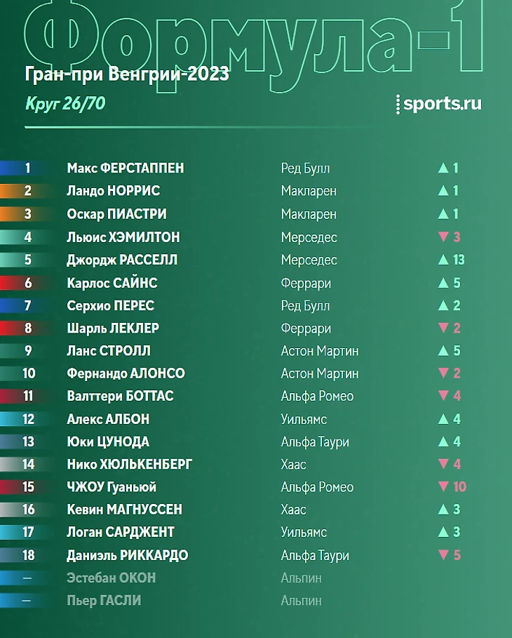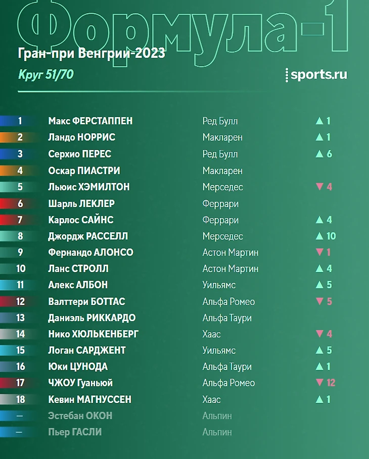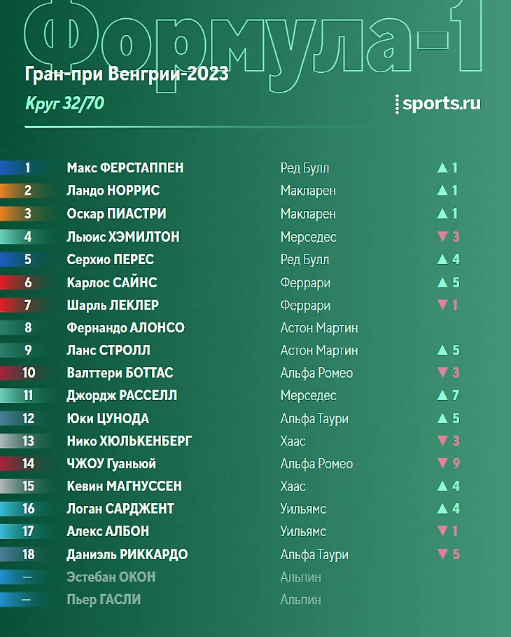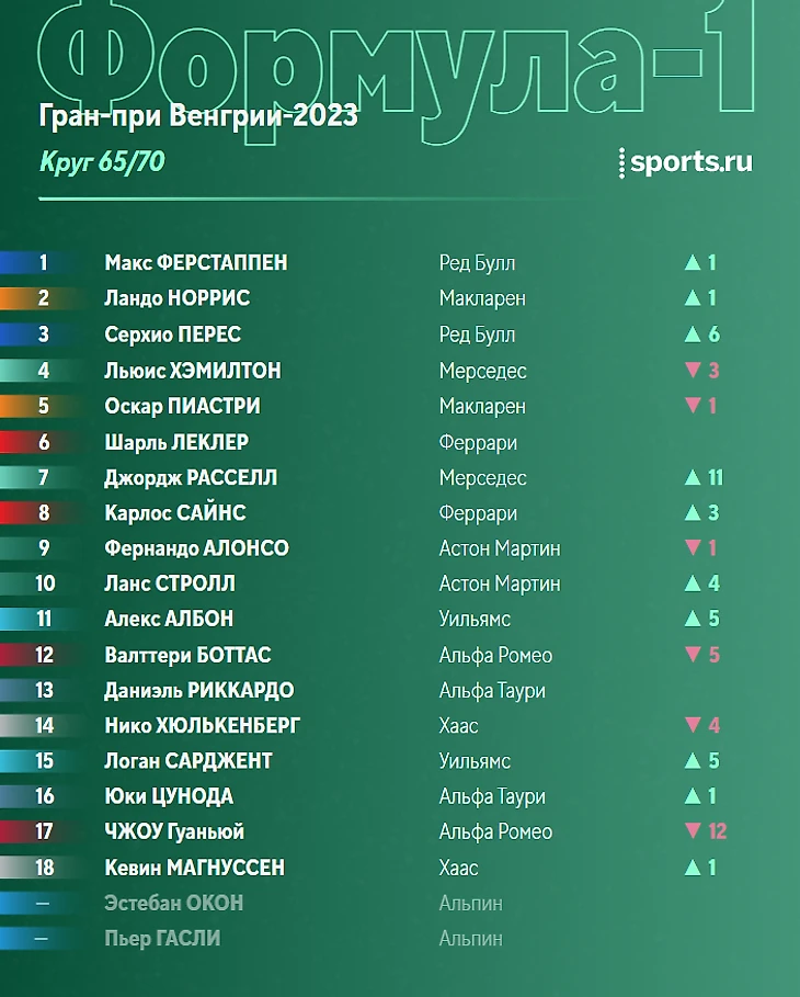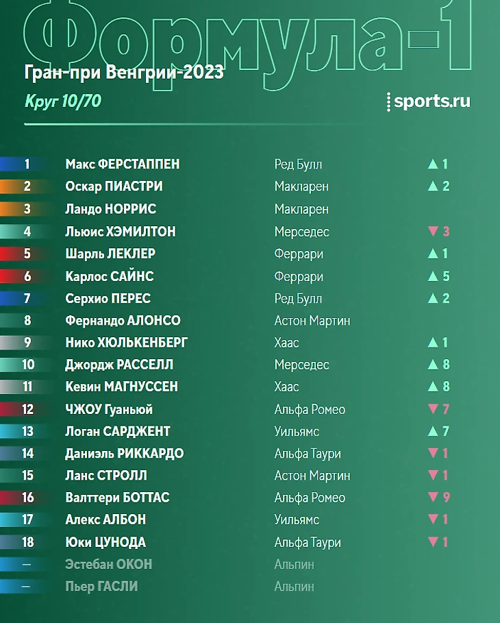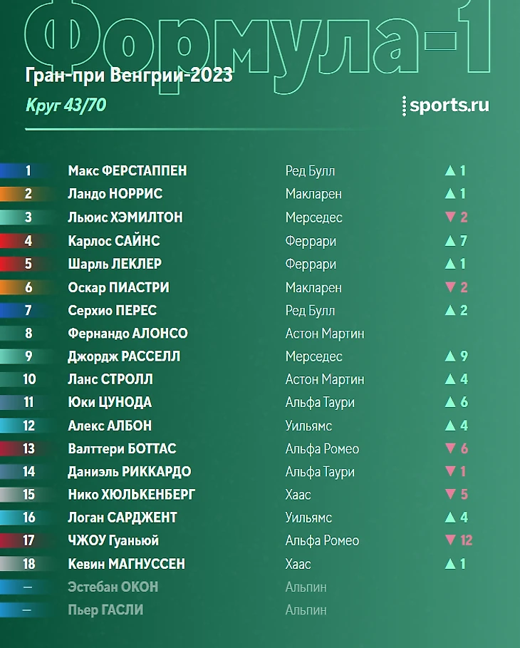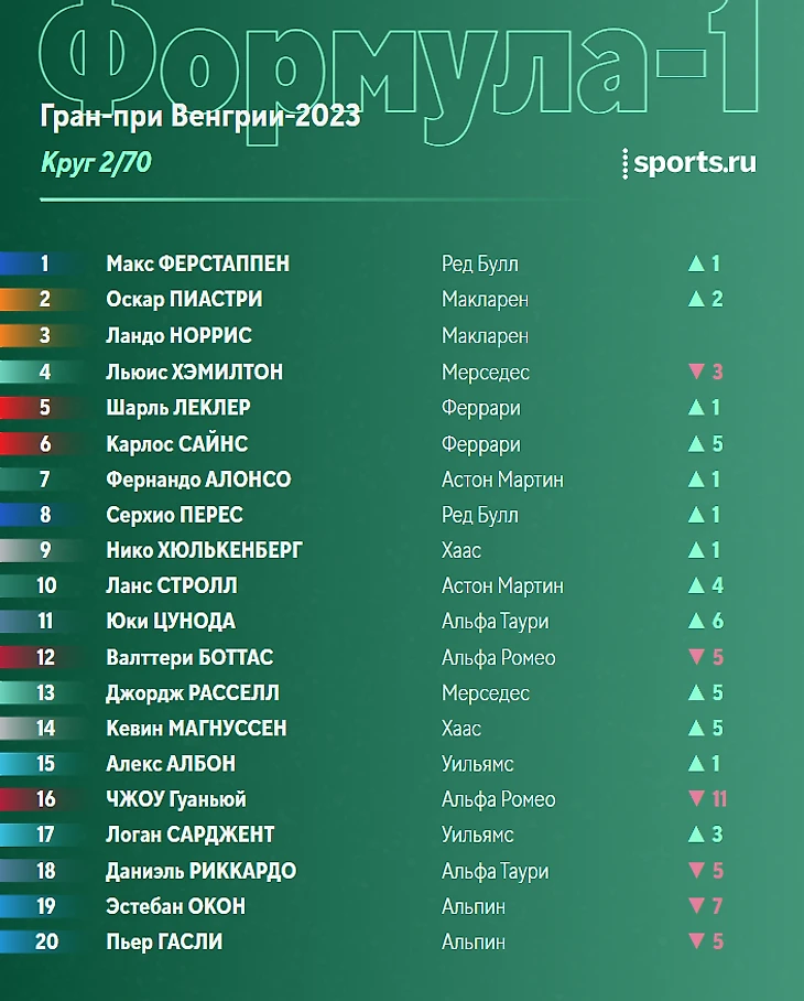 Ферстаппен лидирует, Пиастри и Норрис - второй и третий, Хэмилтон - четвертый, Леклер - 5-й, Сайнс пробился на 6-е место (!), Алонсо, Перес, Хюлькенберг и Стролл - на оставшихся позициях в топ-10.