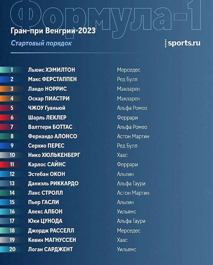 В топ-10 все кроме Переса начнут гонку на «медиуме» (Чеко выбрал «хард»). Остальная часть пелотона разделилась: Сайнс, Стролл, Гасли и Цунода выбрали «софт», Окон, Риккардо, Албон, Магнуссен и Сарджент - «медиум», а Расселл - «хард».